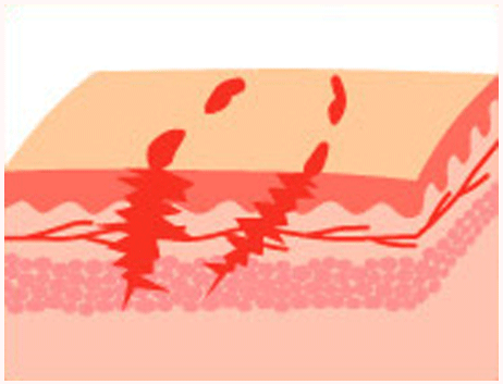 転んでひざをすりむいた場合などザラザラしたものが皮膚をかすることでできるキズです。軽い場合は、表皮や真皮の途中までがこすり取られ、皮下組織は無傷。